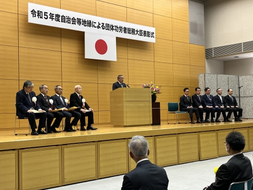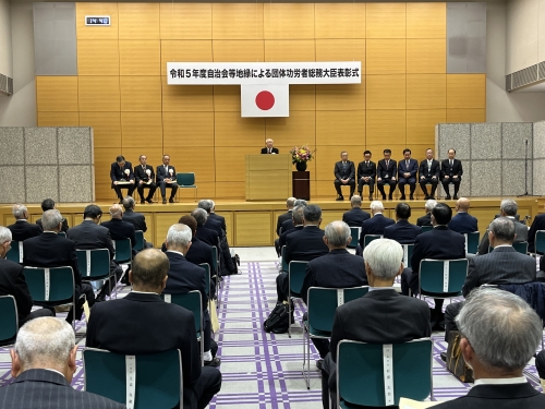 令和5年11月30日、令和5年度の総務大臣表彰式が同省において行われ、長谷川敬二全自連会長が来賓を代表し、祝辞を述べました。この表彰は、自治会・町内会等の地縁による団体の代表として多年にわたり在籍し、良好な地域社会の維持及び形成に顕著な功績があったと認められる方に対し、総務大臣が表彰を行うものです。
